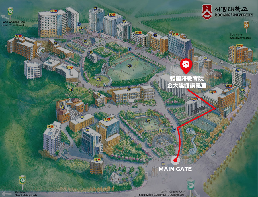 1階入国層5Bあるいは12A乗車上で6002に乗って新村現代デパートで降りる (新村現代デパートまで約80分所要、交通事情よって変わる) |